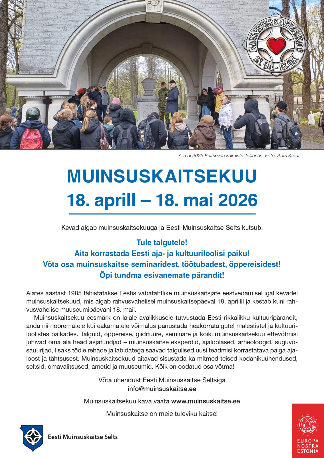 Uudised2026 Muinsuskaitsekuu3. aprill 2026 Muinsuskaitsekuu avame pidulikult laupäeval, 18. aprillil kell 12-15 Rüütelkonna hoones aadressil Kiriku plats 1 (sissepääs Kohtu tänava poolt) Kell 12 – 12.45 tutvustab Eesti esindushoonet Riigikantselei nõunik Gert Uiboaed Kell 13 – 15 Muinsuskaitsekuu pidulik avamine Tervitab Eesti Muinsuskaitse Seltsi esimees Madis Morel Eesti Muinsuskaitse Seltsi tunnustused – teenetemedalid ja tänukirjad. Karuteene Medal Eesti kultuuripärandit oluliselt kahjustanud teo eest. Muusika, kohvilaud. Muinsuskaitse on meie tuleviku kaitse! MUINSUSKAITSEKUU AVAMISELE ON KOHAD TÄIS! Eesti Muinsuskaitse Seltsi suurkogu toimub laupäeval, 11. aprillil kell 1217. märts 2026Ootame seltsikaaslasi laupäeval, 11. aprillil 2026 Tallinnas Pikk tn 46 Eesti Muinsuskaitse Seltsi suurkogule! Kell 11.30 osavõtjate registreerimine, kell 12 suurkogu algus. Kavas aastaaruannete kinnitamine, 2026. aasta tegevuste tutvustus, liikmete sõnavõtud, aastaraamatu 2025 esitlus, vaba vestlus kohvilauas. Kõik liikmed on oodatud! Enne suurkogu palume tasuda liikmemaks 2026. aasta eest. Eesti Muinsuskaitse Selts kutsub mälestama 1944. aasta märtsipommitamise ohvreid17. veebruar 2026Möödub 82 aastat Nõukogude Liidu lennuväe rünnakutest Eesti linnadele. Narva linna purustamise järel 6. märtsil oli suurim Tallinna barbaarne pommitamine 9. märtsi õhtul ja sellele järgneval ööl. Kahes laines, 19.15st kuni kella üheni öösel ja varahommikul kella kolmest kuueni kohale lennanud Nõukogude Liidu lendurid heitsid Tallinnale 1725 lõhke- ja 1300 süütepommi. Rünnaku peamiseks sihiks olid rahulike elanike kodud, mitte vähesed Tallinnas asunud sõjalise otstarbega rajatised. Hansalinn Tallinn sai rängalt kannatada. Süttis eestluse sümboliks olnud Estonia teatrimaja, kus just enne pommirünnakut oli alanud etendus. Põlesid Niguliste kirik, Linnaarhiivi hoone Rüütli tänaval ja vaekoda Raekoja platsil. Kahes rünnakulaines hävis kokku 1549 hoonet ja 3350 sai kahjustada. Tollasest elamispinnast moodustas see ligi kolmandiku. Pea 20 000 elanikku jäi ilma oma kodudest. Rünnaku tagajärjel hukkus 554 Eesti kodanikku, 50 saksa sõdurit ja 121 sõjavangi. aastal alustas Eesti Muinsuskaitse Selts koostöös Tallinna linnaga 1944. aasta 9. märtsi pommitamise ohvrite mälestamist hingepalvega nende kesksel matmispaigal Siselinna kalmistul, mälestusteenistusega Niguliste kirikus ning küünalde süütamisega Harju tänaval Niguliste kiriku ümbruses. Ka meie naabreid soomlasi tabasid samasugused rünnakud – veebruaris ja märtsis pommitas vene lennuvägi armutult Helsingit ja teisi Soome linnu. veebruaril 2022 alustas end Nõukogude Liidu õigusjärglaseks kuulutanud Venemaa sõda iseseisva Ukraina vastu. II maailmasõja lõpp 1945. aastal tõi Eestile ja mitmele teisele riigile kaasa pika ja raske okupatsiooniaja. 82 aastat hiljem ei saa Euroopa lubada ajaloo kordumist. Eesti Muinsuskaitse Selts kutsub osa võtma mälestuspäevast 9. märtsil: Kell 12 mälestusteenistus ohvrite matmispaigal Siselinna kalmistul. Hingepalve peab Eesti Apostliku Õigeusu kiriku ülempreester Aleksander Sarapik. Kell 18 – 19 mälestuskontsert Niguliste muuseumis. Esineb Püha Miikaeli Kooli poistekoor Arno Gabriel Humala juhatamisel, orelil Tiit Kiik. Kõnelevad Tallinna linnapea Peeter Raudsepp ja Eesti Muinsuskaitse Seltsi esimees Madis Morel. Teenib Toompraost Arho Tuhkru. Kell 19.15 süütame küünlad Harju tänaval. Helisevad Tallinna kirikute leinakellad. EMS juhatuse liige Mehis Pever pälvis kõrge riikliku tunnustuse2. veebruar 2026Eesti Muinsuskaitse Seltsi juhatuse liige Mehis Pever pälvis kõrge riikliku tunnustuse – Valgetähe IV klassi teenetemärgi hariduselu edendamise eest Tallinnas. Palju, palju õnne, Mehis!!! Mehis Pever. Peeter Hüti foto Fotol on Mehis aastal 2021, mil Eesti Muinsuskaitse Selts tunnustas Patarei merekindluses toimunud pidulikul tseremoonial Mehist teenetemedaliga pikaajalise hea koostöö eest Eesti Muinsuskaitse Seltsi ja Tallinna Ühisgümnaasiumi vahel ja noortes muinsuskaitsehuvi äratamise eest. Relvarahu 3. jaanuaril2. jaanuar 2026Vabadussõjas võidelnuid mälestame 3. jaanuaril kell 10.30 üle Eesti sada sekundit kestva vaikusega. Üle Eesti helisevad kirikukellad, kostavad veduriviled ja laevapasunad. Süütame Vabadussõjaga seotud mälestuspaikades küünlad ja asetame pärjad. Peatame kangelaste mälestuseks oma tavapärased toimingud, koguneme mälestussammaste juurde ja avaldame austust Eest eest elanud ja elu andnud inimestele. Eesti lipu heiskavad kõik riigi- ja omavalitsusasutused ning avalik-õiguslikud juriidilised isikud. Kodumaa vabaduse eest võidelnute auks ja mälestuseks on kõik teisedki oodatud lippe heiskama. Lipud heisatakse päikesetõusul ning langetatakse päikeseloojangul. Vabadussõjas võidelnute mälestuspäeva tähistatakse Tallinnas Vabaduse platsil, Kaitseväe klamistul, Reaalkooli juures, samuti Viimsi mõisa pargis kindral Johan Laidoneri ja Maria Laidoneri mälestusmärgi juurdes ning Vabadussõja ausammaste juures kõikjal Eestis. Punaarmee üksused ületasid Narva jõe 8. novembril 1918 ja sellega algas võitlus Eesti Vabariigi eest. Vabadussõjas astusid noore riigi vaprad kaitsjad Nõukogude Venemaa ja Saksa Landeswehri vastu. Raskes võitluses saavutati edu. 3. jaanuaril 1920 kell 10.30 algas vaherahu Eesti ja Nõukogude Venemaa vahel. Eesti väed kaotasid Vabadussõjas kokku üle 6000 inimese, neist 3588 otseses lahingutegevuses.
